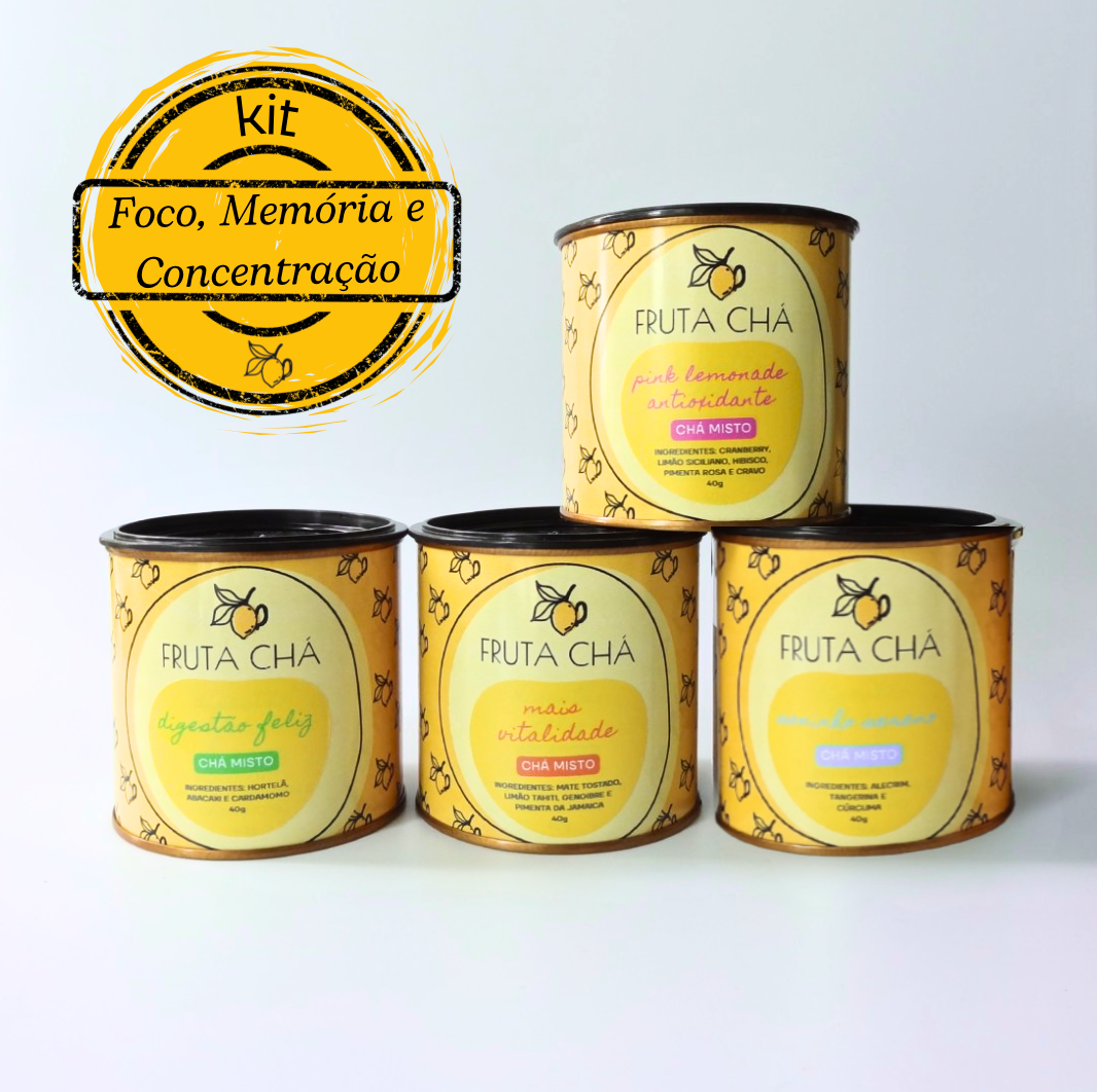 o kit Foco, Memória e Concentração foi criado para estimular sua mente e trazer mais clareza para o seu dia. Todas as infusões do kit podem ser apreciadas geladas ou quentes e combinam ingredientes naturais que ajudam na cognição, aumentando a energia mental e a produtividade.